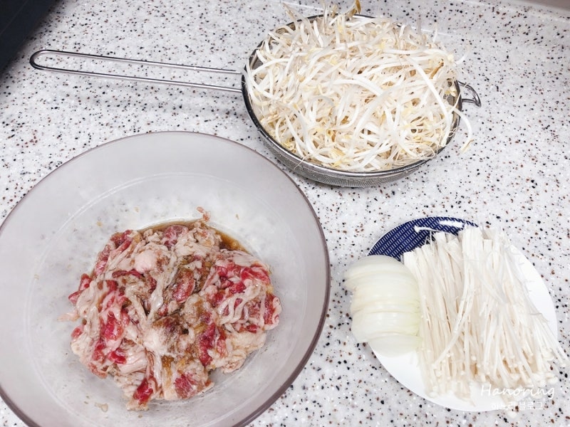 * 차돌박이장조림간장3스푼,식초5방울,마늘2스푼,물엿1스푼,설탕3스푼,굴소스1스푼,청양고추3개,후추그리고물도아주조금넣었습니다. 저희 간장은 버섯간장이라 약간 짠간장이라 물을 필수고 이건 2인분 양념이라 인분에 맞게 만들어주세요 :)[차돌박이 요리]차돌박이 숙주볶음 만들기 02 완성된 양념장을 차돌박이 그릇에 부었습니다.그릇에 양념장을 넣고 잘 섞어서 랩으로 밀봉해서 씌운 다음 냉장고에 20분 정도 넣으면 숙성이 잘 되거든요, 20분 동안 냉장에 넣어두면 양념장도 잘 썰리고 맛있었습니다.[우삼겹요리] 우삼겹숙주볶음만들기 03 그다음에 숙주주머니를 열고 숙주를 손질해서 깨끗이 씻어줬어요깨끗이 찬물에 헹군 숙주는 채썰어 물이 빠지게 놓았습니다.금방 볶으니까 물이 빠지면 돼요 어차피 같이 넣을 버섯에서 물이 많이 나오니까 다른 물기는 필요 없거든요.차돌박이볶음 만들기 준비 완료, 재료 손질도 끝났고 양념장과 버무려놓은 고기 숙성도 끝났습니다.차돌보다는 조금 기름지다? 라는 느낌이었습니다. 그래도 맛있을거야 고기는 무엇을 하든 중간은 갑니다귤땡이 1번으로 꼽는 제 요리 차돌박이 숙주볶음을 이겨보고 싶네요. 용 #차돌박이 숙주볶음[차돌박이]차돌박이 숙주볶음 만들기 04 먼저 펜을 달구고 그 위에 올리브유를 듬뿍 뿌려줍니다.그리고 대파하고 다진마늘 넣고 파기름 맛있게 냅니다.확실히 이기고 요리하는 거랑 그냥 하는 거랑은 전혀 다르거든요.파기름 마늘기름 ww 베이스 중 베이스입니다.불을 좀 세게 해놔서 좀 탔어.[우삼겹요리] 우삼겹 숙주볶음 만들기 05 그다음 양파도 넣고 신나게 볶는다!마늘기름, 파기름이 타버려서… 불에 탔는데 결론은 맛있었다는 거야.[우삼겹요리] 우삼겹 숙주볶음 만들기 05 그다음 양파도 넣고 신나게 볶는다!마늘기름, 파기름이 타버려서… 불에 탔는데 결론은 맛있었다는 거야.[우삼겹요리] 우삼겹숙주볶음만들기06 마지막에 양념장에 재워놓은 고기랑 그 위에 버섯을 올려서 볶았어요.버섯에서 나오는 버섯물이 생겨서 잘 볶아져서 맛있거든요.그리고 타지도 않게 물이 나와서 적절했어요.살짝 삶으면서 수분을 날리면서 볶아주더라구요:) 맛있는 냄새가 난다고 ㅋㅋ[차돌박이 요리] 차돌박이 콩나물볶음만들기07 그리고 마지막으로 어느 정도 고기가 볶아지면 콩나물을 한 줌 얹었습니다.원래 뚜껑 있으면 닫아도 되는데 저는 그냥 볶아도 잘 볶거든요.볶음빵을 살때 항상 뚜껑을 잊어버리고 사버렸습니다.다음에는 꼭 뚜껑도!소고기장미요리 끝!! 완성차돌박이콩볶음 완성 – 콩나물과 새우 덕분에 국물이 많이 나고 부피가 커지지 않고 맛있어졌습니다 귤텐과 맛있게 싸먹고 마지막으로 한국인 디저트 밥도 볶아먹고 맛있는 한끼였습니다.또 요리를 해보겠습니다.:) 하놀린 요리 블로그 끝♡https://www.youtube.com/watch?v=khTQZ-Cnz5Q