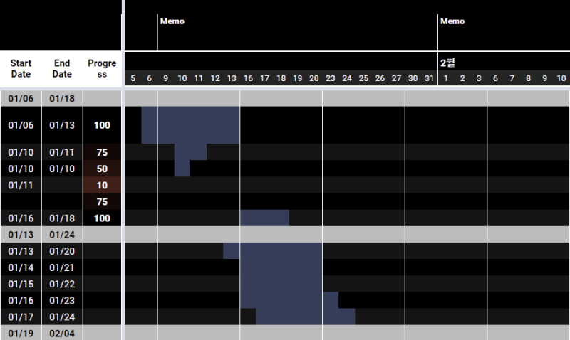 이 시트의 백미는 스케줄에 따라 Timeline이 자동으로 구성되는 것입니다. 문서를 만들 때 셀을 지정하고 일일이 셀 서식을 지정해 주는 것만큼 번거로운 일은 없을 것입니다. 디자인은 취향에 맞게 선택해주세요. 일부러 다크모드를 만들어봤어요. 스마트폰을 다크 모드로 설정하여 사용하고 있습니다만, 훨씬 가독성이 좋고 눈의 피로도 적습니다.